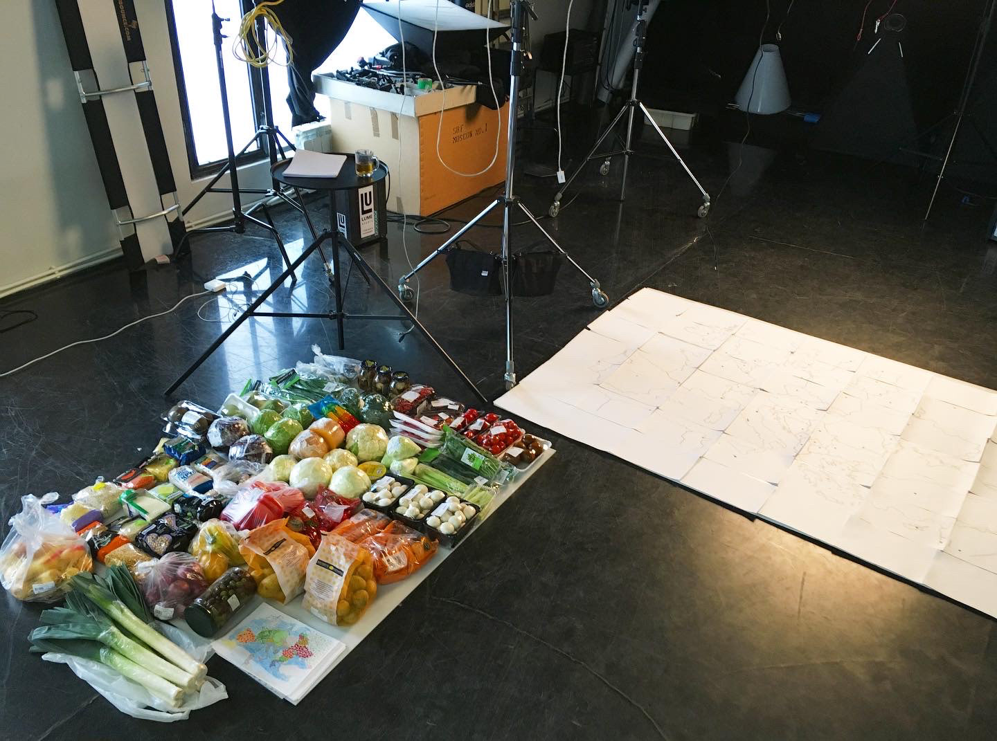 Нарисовала эскиз, напечатала его на 25 листов А4, разложила на полу, посмотрела и поняла, что получается слишком маленький размер карты и овощи не будут читаться или выглядеть интересно. Напечатала еще раз карту на 49 листов, разложила и поняла, что теперь будет в самый раз.